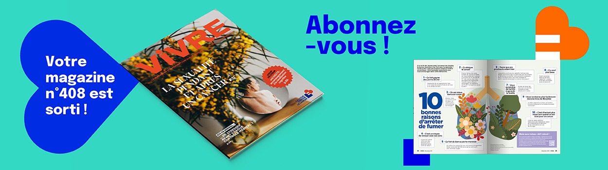 S’abonner à Vivre, c’est bien plus que lire un magazine : c’est soutenir une cause essentielle. Chaque numéro contribue à sensibiliser sur la prévention, informer sur les avancées scientifiques, à accompagner les personnes malades et leurs proches aidants et lutter contre toutes les formes d’inégalités. Un geste simple, mais un impact réel pour mieux lutter, ensemble, contre le cancer.