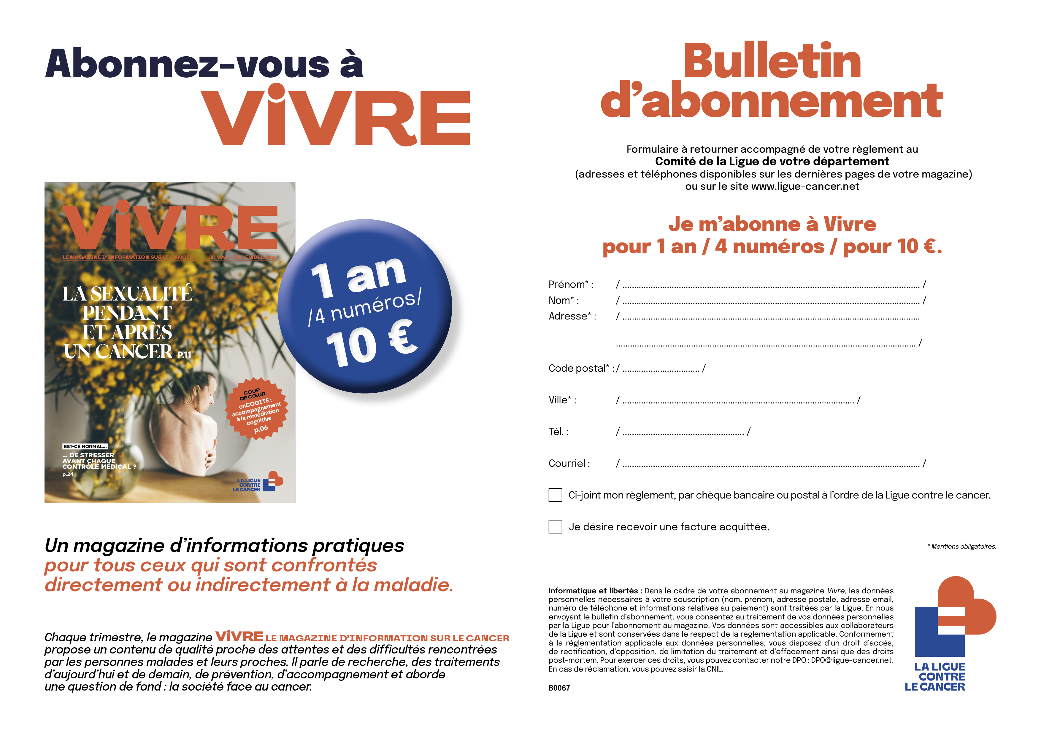S’abonner à Vivre, c’est bien plus que lire un magazine : c’est soutenir une cause essentielle. Chaque numéro contribue à sensibiliser sur la prévention, informer sur les avancées scientifiques, à accompagner les personnes malades et leurs proches aidants et lutter contre toutes les formes d’inégalités. Un geste simple, mais un impact réel pour mieux lutter, ensemble, contre le cancer.